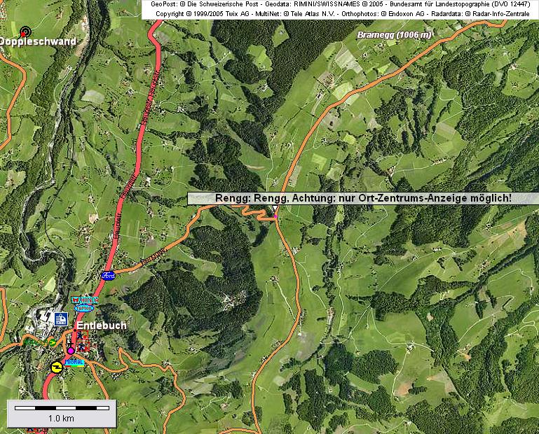 Nebenstehend: Kartenausschnitt mit dem Dorf RENGG, Rengg-Strasse abzweigend in Entlebuch, Kanton Luzern. Restaurant RENGG befindet sich an der Weggabelung in RENGG an der Rengg-Strasse. RENGG bedeutet "Rank" (Kurve) und zeigt den Ursprung der Familie der Renggli von Entlebuch. Rengg-li zeugt von "denen im Rank [in/an der Kurve] lebend".