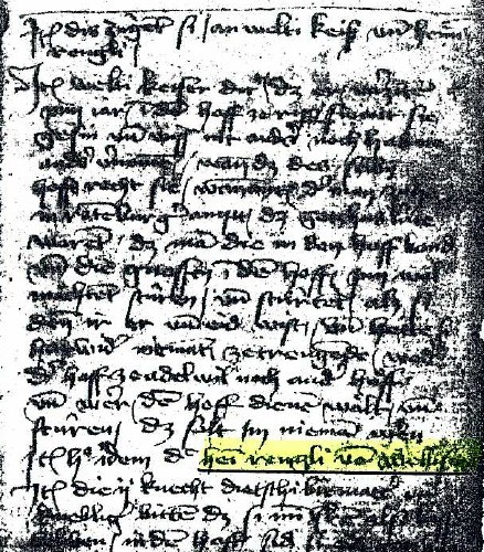 Erste urkundliche Erwähnung des Names Renggli aus Entlebuch (Quelle: Staatsarchiv Luzern, Urkunde Nr. 466/8328, publiziert in "Quellenwerk zur Entstehung der Schweizerischen Eidgenossenschaft", I. Urkunde, Band 2, S. 368, Nr. 733):